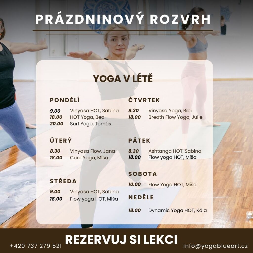 Letní dny jsou tady a s nimi přichází i nový letní rozvrh lekcí v našem studiu. Přizpůsobili jsme ho volnějšímu tempu prázdnin, slunci, teplým večerům i vašim dovoleným. Ať už chcete načerpat novou energii, protáhnout tělo nebo se jen na chvíli zastavit, u nás si vyberete. Přijďte si užít léto na podložce – v lehkosti, s dechem a v pohybu.